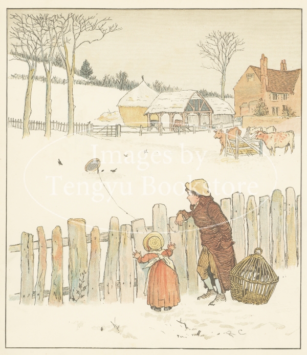 19世紀イギリスを代表する絵本作家の一人、ランドルフ・コルデコット(1846-1886)の絵本「6ペンスの歌を歌おう」の挿絵。