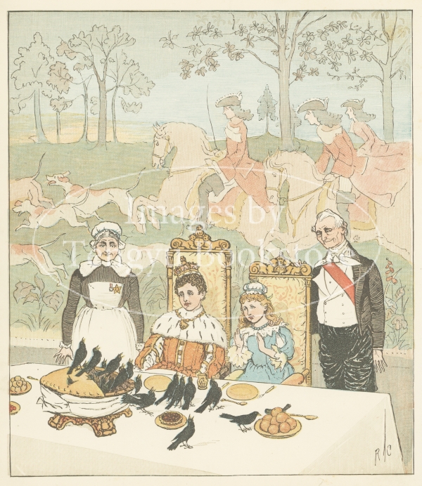 19世紀イギリスを代表する絵本作家の一人、ランドルフ・コルデコット(1846-1886)の絵本「6ペンスの歌を歌おう」の挿絵。