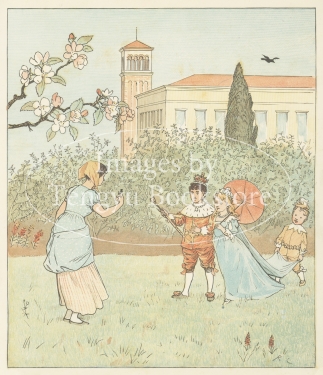 19世紀イギリスを代表する絵本作家の一人、ランドルフ・コルデコット(1846-1886)の絵本「6ペンスの歌を歌おう」の挿絵。