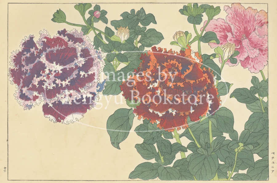 明治大正期の染色図案家 谷上広南(1879‐1928)による木版画集「西洋草花図譜」の1図。当時輸入された海外の草花をおよそ100点取り上げ、色鮮やかな木版画で描いた本作は、日本製のボタニカルアートとして人気の高い作品集です。