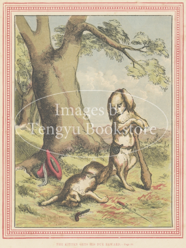 19世紀スコットランドの作家ロバート・マイケル・バランタイン(1825-1894)作の絵本「山賊こねこ」の挿絵。当時数多くの児童向け作品を手掛けたR.M.バランタインによる動物絵本シリーズのひとつである本書は、家を出て山賊になった子猫の顛末を描いたもの。