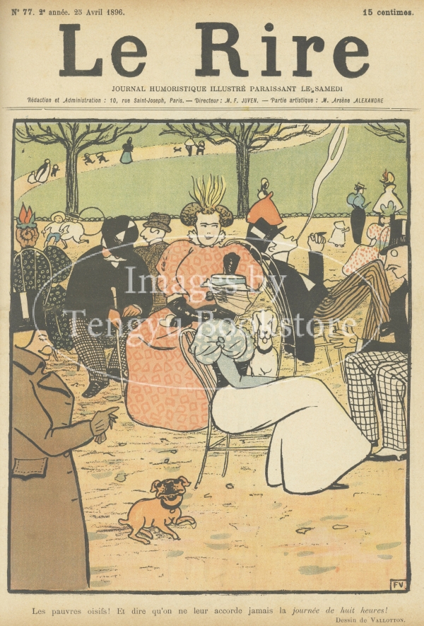 19世紀末フランスの雑誌「ル・リール(笑い)」の表紙。本書は1894年の創刊から1950年代まで続いた風刺雑誌。表紙から本文カットにいたるまでふんだんにイラストが用いられており、ロートレックやスタンラン等のベルエポックを代表するイラストレーターたちが腕を競った賑やかな誌面が当時高い人気を博しました。