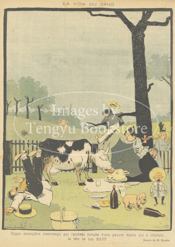 本書は1894年の創刊から1950年代まで続いた風刺雑誌。表紙から本文カットにいたるまでふんだんにイラストが用いられており、ロートレックやスタンラン等のベルエポックを代表するイラストレーターたちが腕を競った賑やかな誌面が当時高い人気を博しました。