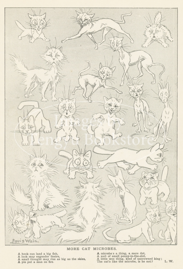 19世紀末~20世紀初期イギリスのイラストレーター、ルイス・ウェイン(1860-1936)の作品集「ルイス・ウェイン年鑑」より。本書は、猫の画家として当時一世を風靡したルイス・ウェインによる短い絵物語を多数収録したもの。