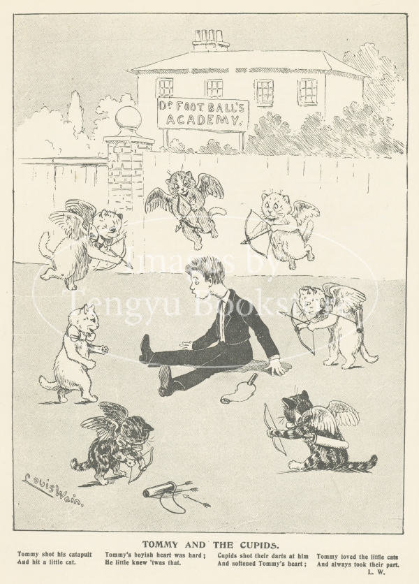 19世紀末~20世紀初期イギリスのイラストレーター、ルイス・ウェイン(1860-1936)の作品集「ルイス・ウェイン年鑑」より。本書は、猫の画家として当時一世を風靡したルイス・ウェインによる短い絵物語を多数収録したもの。