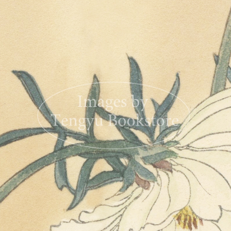 明治大正期の染色図案家 谷上広南(1879‐1928)による木版画集「西洋草花図譜」の1図。当時輸入された海外の草花をおよそ100点取り上げ、色鮮やかな木版画で描いた本作は、日本製のボタニカルアートとして人気の高い作品集です。