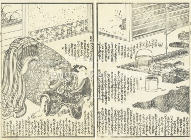 江戸時代後期の草双紙「明鴉墨画廼裲襠 (あけがらすすみえのうちかけ)」からの一枚。
