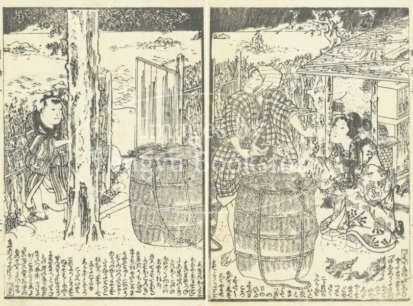 江戸時代後期の草双紙「明鴉墨画廼裲襠 (あけがらすすみえのうちかけ)」からの一枚。
