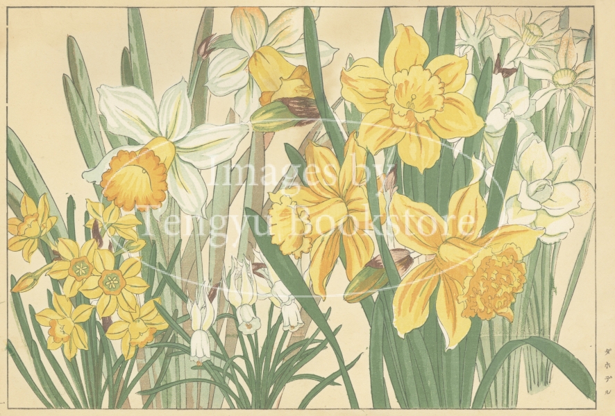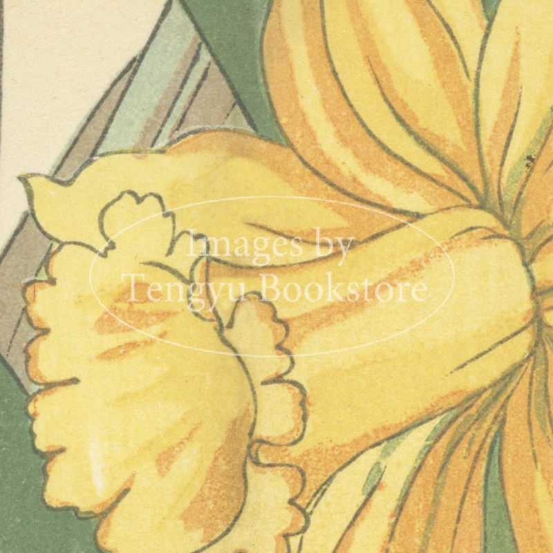 明治大正期の染色図案家 谷上広南(1879‐1928)による木版画集「西洋草花図譜」の1図。当時輸入された海外の草花をおよそ100点取り上げ、色鮮やかな木版画で描いた本作は、日本製のボタニカルアートとして人気の高い作品集です。