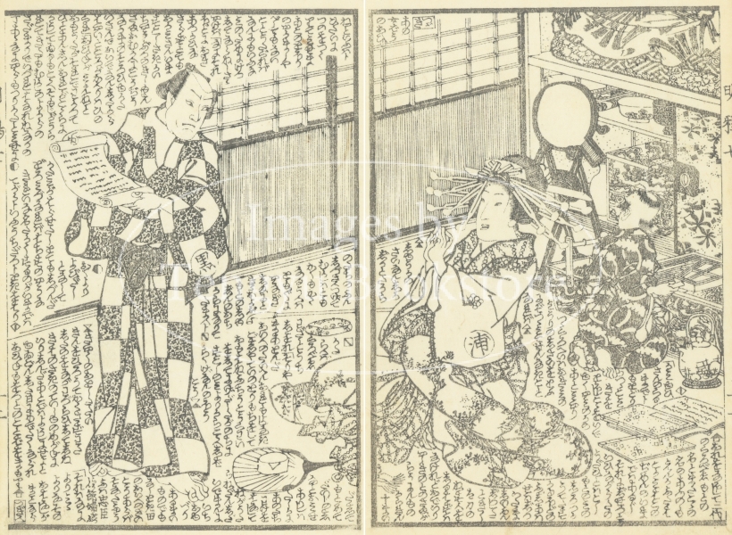 江戸時代後期の草双紙「明鴉墨画廼裲襠 (あけがらすすみえのうちかけ)」からの一枚。