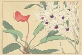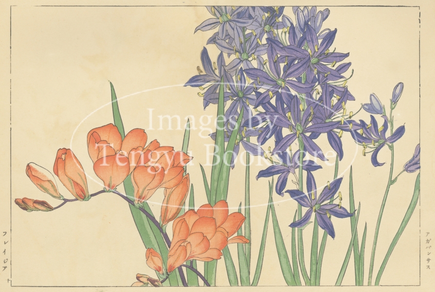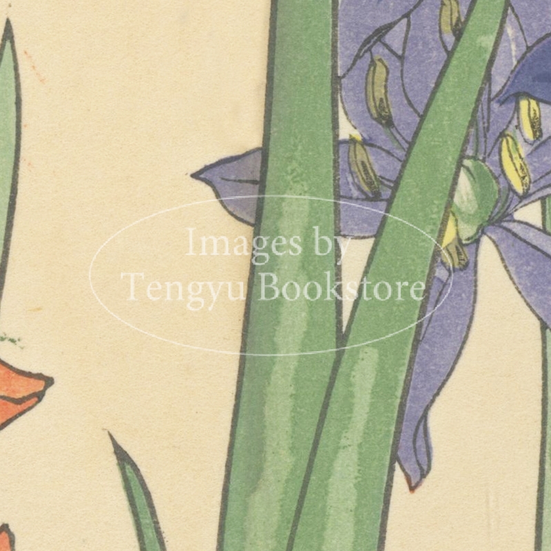 明治大正期の染色図案家 谷上広南(1879‐1928)による木版画集「西洋草花図譜」の1図。当時輸入された海外の草花をおよそ100点取り上げ、色鮮やかな木版画で描いた本作は、日本製のボタニカルアートとして人気の高い作品集です。