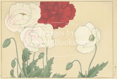 明治大正期の染色図案家 谷上広南(1879‐1928)による木版画集「西洋草花図譜」の1図。当時輸入された海外の草花をおよそ100点取り上げ、色鮮やかな木版画で描いた本作は、日本製のボタニカルアートとして人気の高い作品集です。