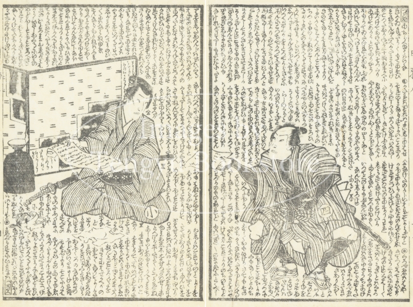 江戸時代後期の草双紙「明鴉墨画廼裲襠 (あけがらすすみえのうちかけ)」からの一枚。