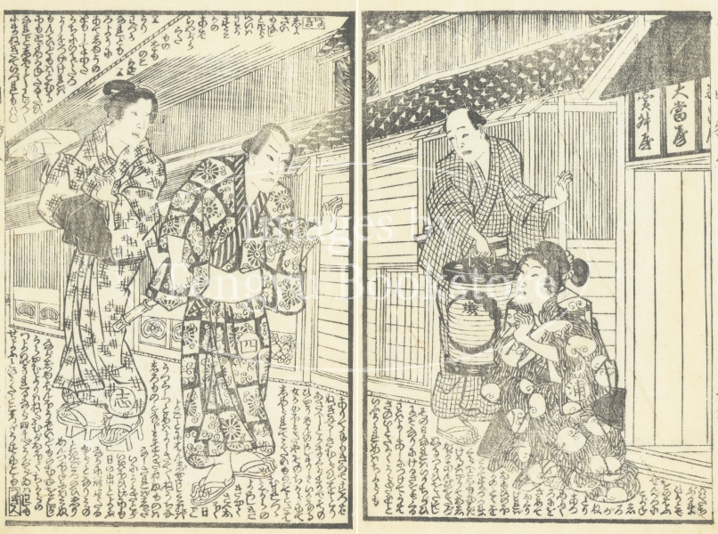 江戸時代後期の草双紙「明鴉墨画廼裲襠 (あけがらすすみえのうちかけ)」からの一枚。