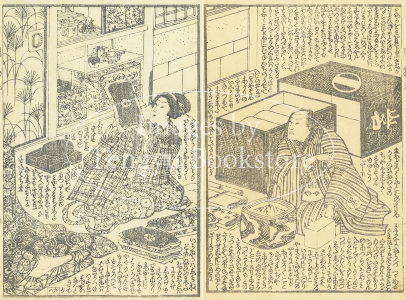 江戸時代後期の草双紙「明鴉墨画廼裲襠 (あけがらすすみえのうちかけ)」からの一枚。