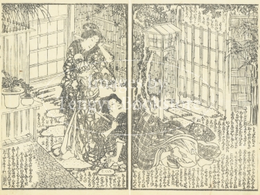 江戸時代後期の草双紙「明鴉墨画廼裲襠 (あけがらすすみえのうちかけ)」からの一枚。