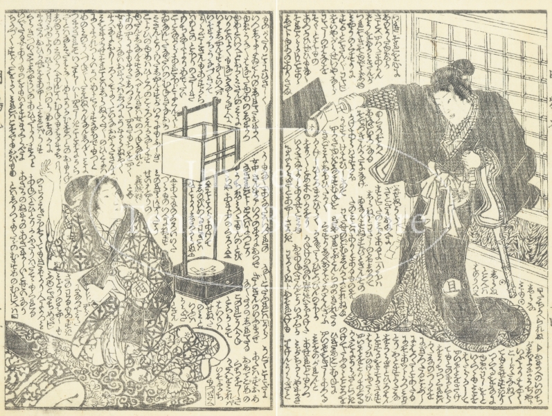 江戸時代後期の草双紙「明鴉墨画廼裲襠 (あけがらすすみえのうちかけ)」からの一枚。