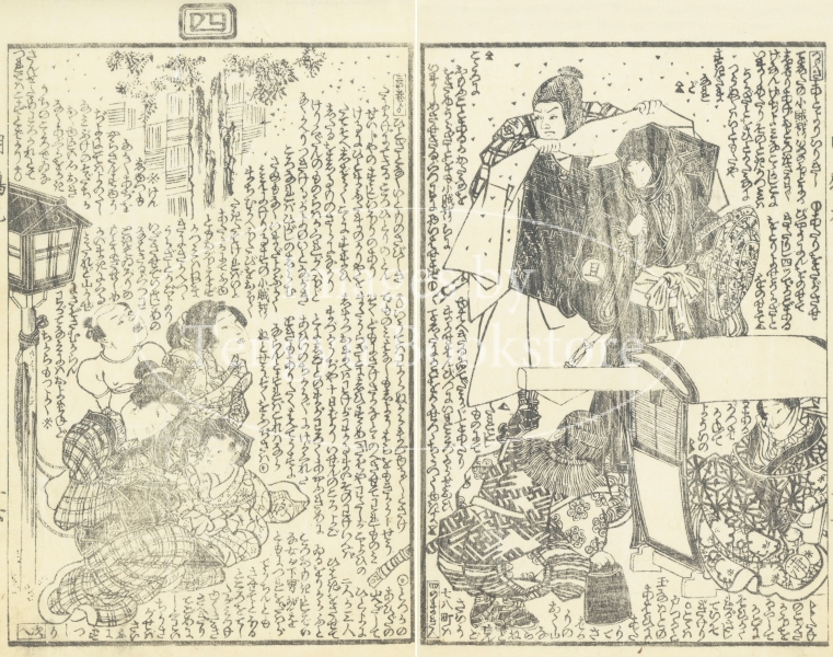 江戸時代後期の草双紙「明鴉墨画廼裲襠 (あけがらすすみえのうちかけ)」からの一枚。