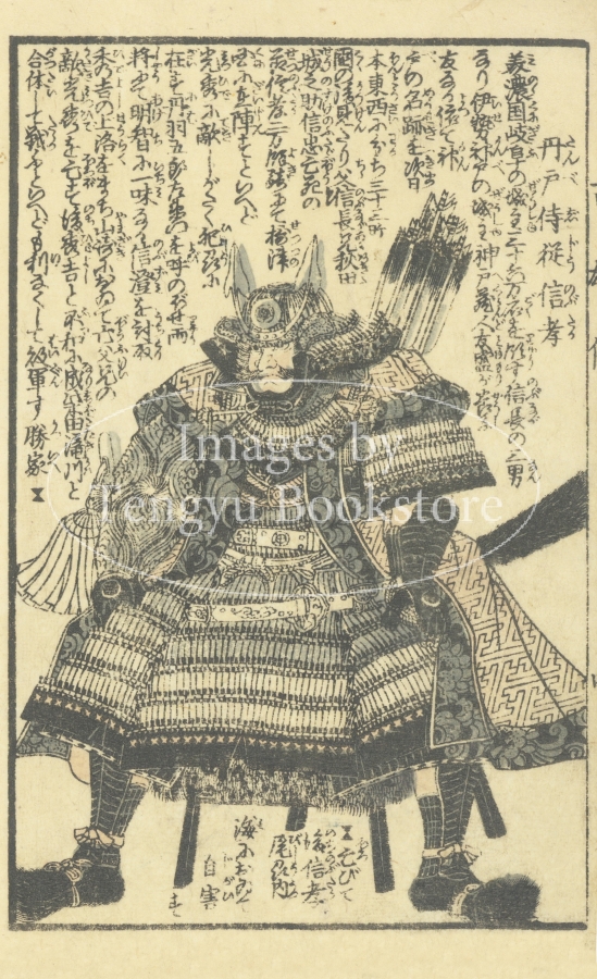 江戸後期の絵入り略伝集「英名百雄伝」からの一枚。安土桃山時代に活躍した武将たちを、一人一人の逸話とともに紹介したもの。挿絵は、幕末・明治時代の浮世絵師 歌川貞秀(玉蘭斎/五雲亭貞秀:1807-1879)が手がけています。