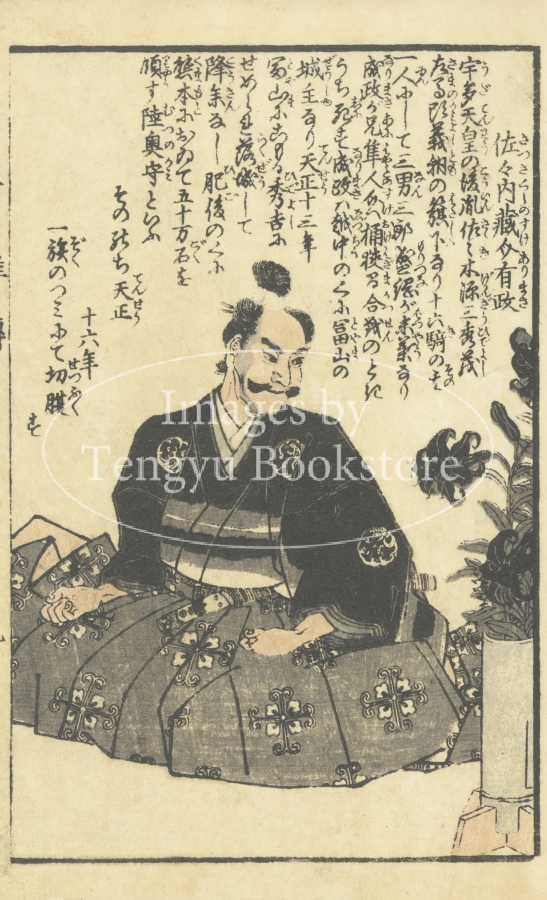 江戸後期の絵入り略伝集「英名百雄伝」からの一枚。安土桃山時代に活躍した武将たちを、一人一人の逸話とともに紹介したもの。挿絵は、幕末・明治時代の浮世絵師 歌川貞秀(玉蘭斎/五雲亭貞秀:1807-1879)が手がけています。
