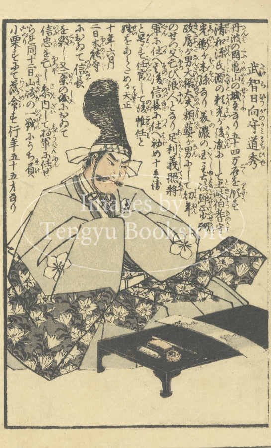江戸後期の絵入り略伝集「英名百雄伝」からの一枚。安土桃山時代に活躍した武将たちを、一人一人の逸話とともに紹介したもの。挿絵は、幕末・明治時代の浮世絵師 歌川貞秀(玉蘭斎/五雲亭貞秀:1807-1879)が手がけています。