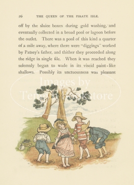 19世紀アメリカの作家ブレット・ハートによる少年少女の冒険物語に、19世紀イギリスを代表する絵本作家ケイト・グリーナウェイ(1846-1901)のイラストをそえた挿絵本「海賊島の女王」の挿絵。