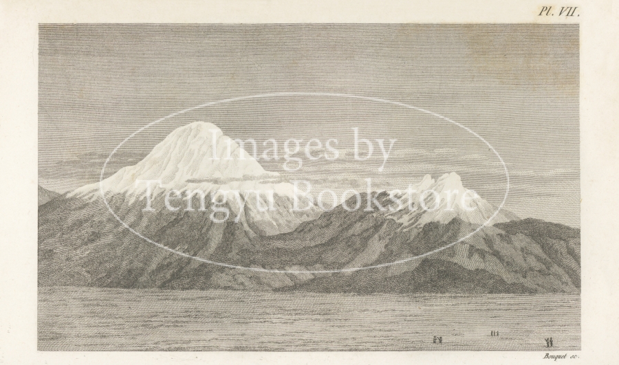 18-19世紀ドイツの探検家、博物学者アレクサンダー・フォン・フンボルト(1769-1859)が調査した南米の山や古代遺跡を挿絵入りで記録した紀行書「アメリカの山脈と先住民モニュメント」の挿絵。本書は1810年に大型本として発表された後に出版された小型本。