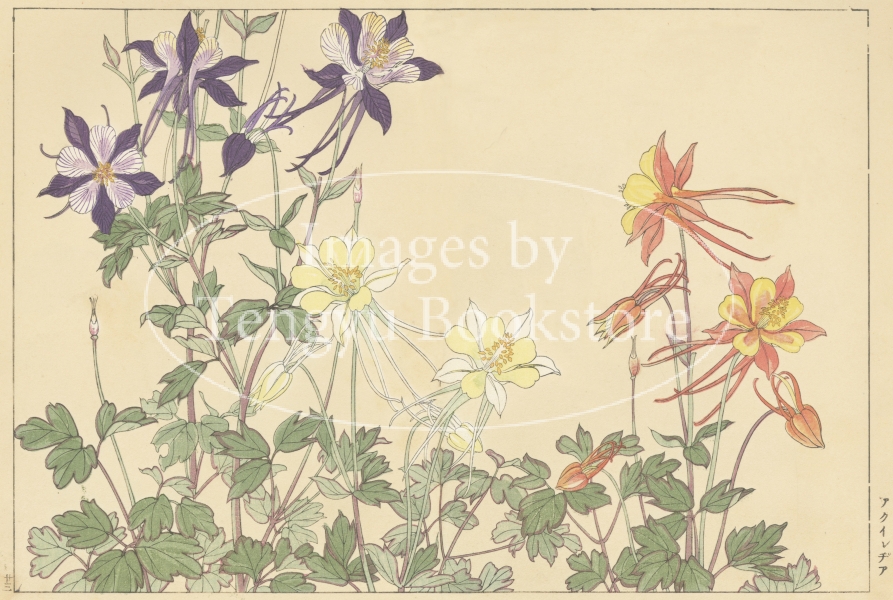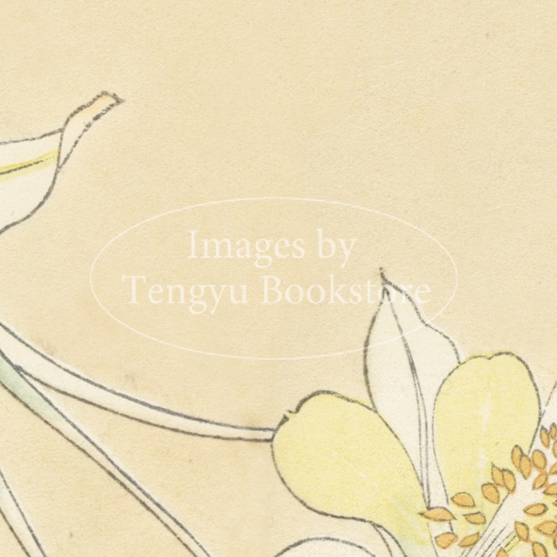明治大正期の染色図案家 谷上広南(1879‐1928)による木版画集「西洋草花図譜」の1図。当時輸入された海外の草花をおよそ100点取り上げ、色鮮やかな木版画で描いた本作は、日本製のボタニカルアートとして人気の高い作品集です。