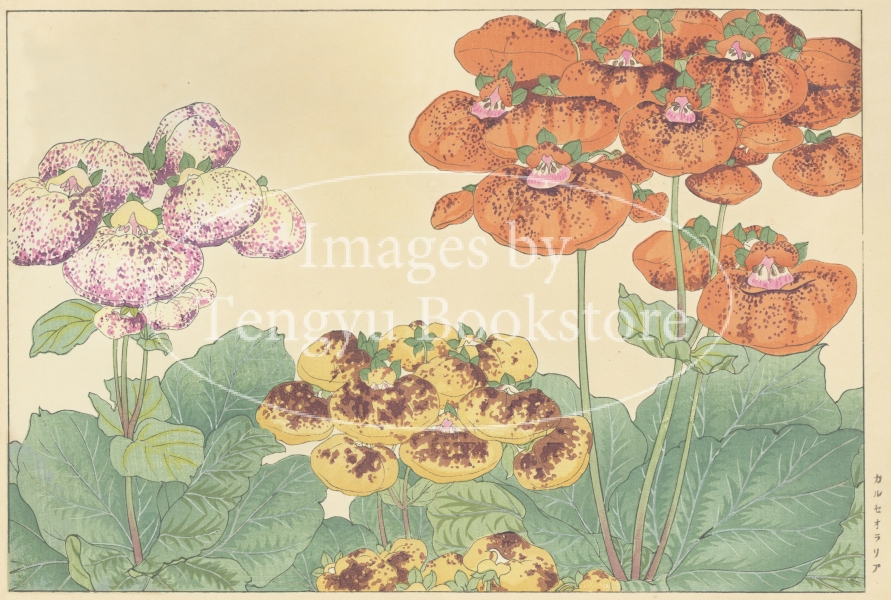 明治大正期の染色図案家 谷上広南(1879‐1928)による木版画集「西洋草花図譜」の1図。当時輸入された海外の草花をおよそ100点取り上げ、色鮮やかな木版画で描いた本作は、日本製のボタニカルアートとして人気の高い作品集です。