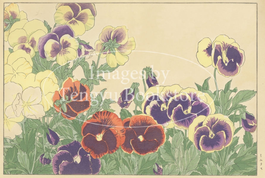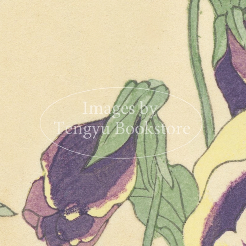 明治大正期の染色図案家 谷上広南(1879‐1928)による木版画集「西洋草花図譜」の1図。当時輸入された海外の草花をおよそ100点取り上げ、色鮮やかな木版画で描いた本作は、日本製のボタニカルアートとして人気の高い作品集です。
