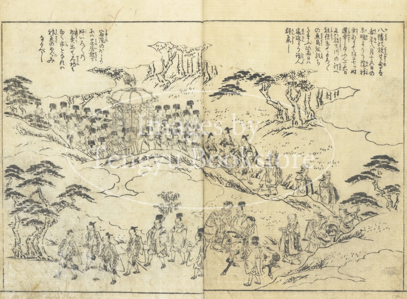 編者である京都の文人 秋里籬島(あきさと りとう)と、挿絵を手掛けた大阪の浮世絵師、竹原春朝斎(たけはらしゅんちょうさい)は、これ以後、大阪の題材にした「摂津名所図会」をはじめ、日本各地の絵入り地誌を作成することになる、「名所図絵」の第一人者です。