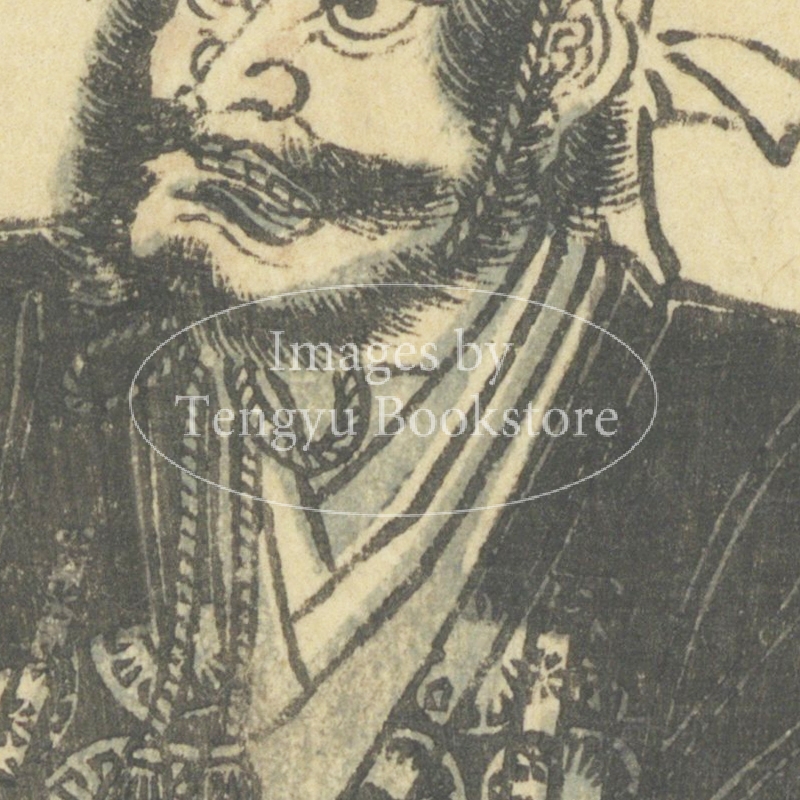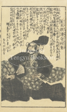 江戸後期の絵入り略伝集「英名百雄伝」からの一枚。安土桃山時代に活躍した武将たちを、一人一人の逸話とともに紹介したもの。挿絵は、幕末・明治時代の浮世絵師 歌川貞秀(玉蘭斎/五雲亭貞秀:1807-1879)が手がけています。