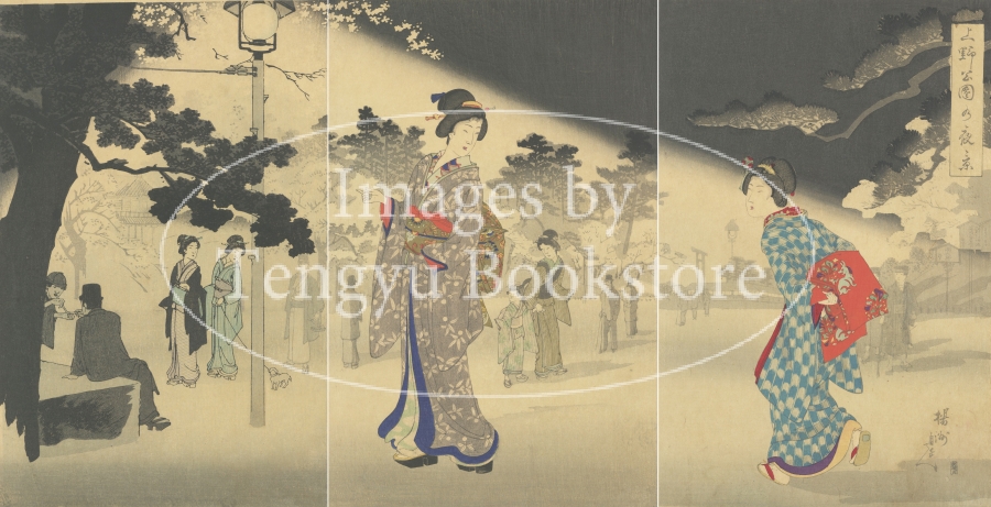 明治から昭和にかけての浮世絵師 楊斎 延一(1872-1944) による、上野公園の風景を描いた三枚続の浮世絵。