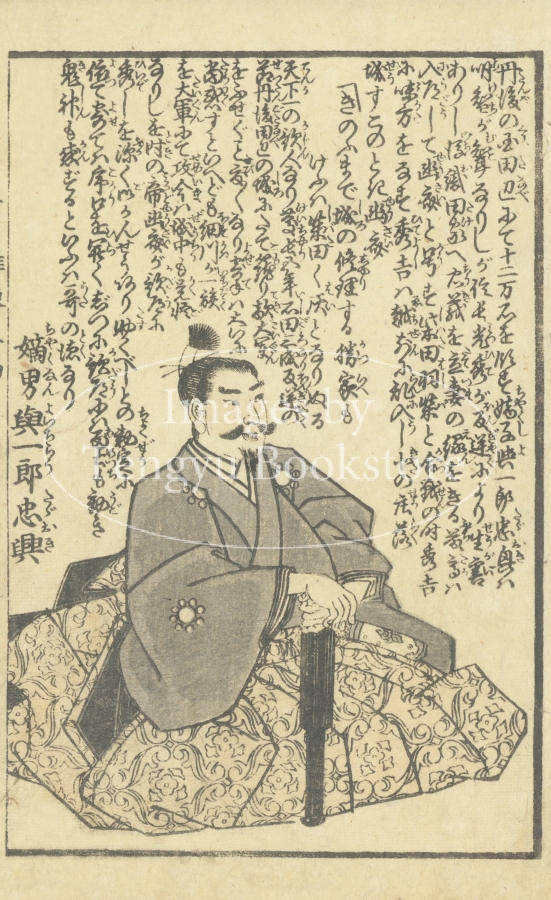 江戸後期の絵入り略伝集「英名百雄伝」からの一枚。安土桃山時代に活躍した武将たちを、一人一人の逸話とともに紹介したもの。挿絵は、幕末・明治時代の浮世絵師 歌川貞秀(玉蘭斎/五雲亭貞秀:1807-1879)が手がけています。