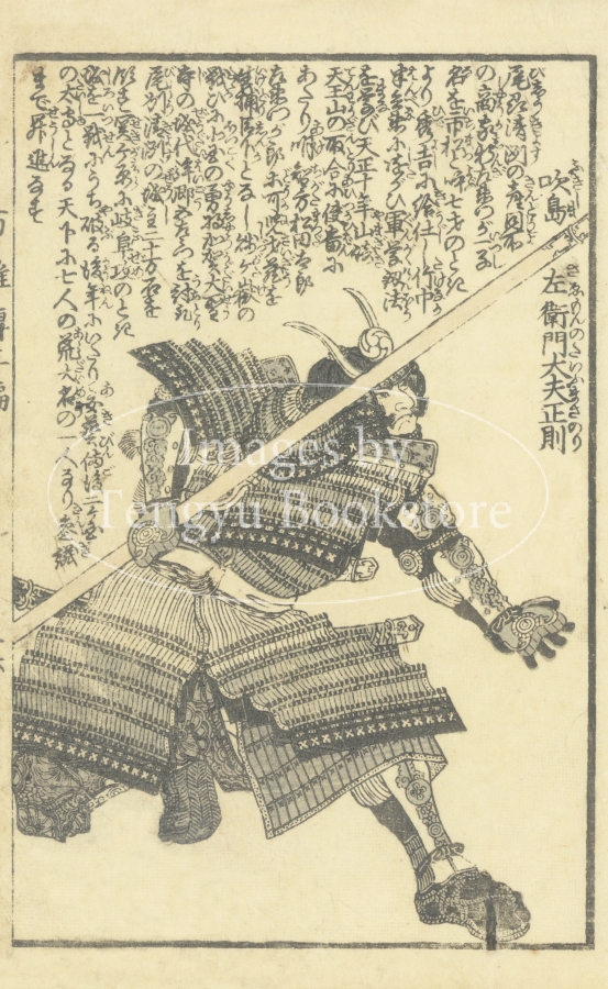 江戸後期の絵入り略伝集「英名百雄伝」からの一枚。安土桃山時代に活躍した武将たちを、一人一人の逸話とともに紹介したもの。挿絵は、幕末・明治時代の浮世絵師 歌川貞秀(玉蘭斎/五雲亭貞秀:1807-1879)が手がけています。