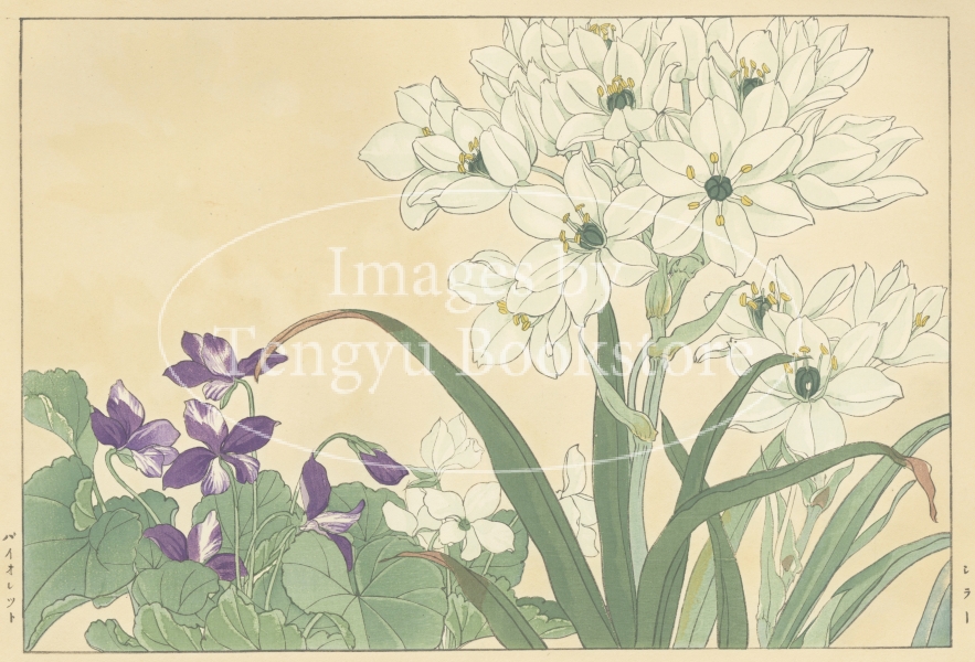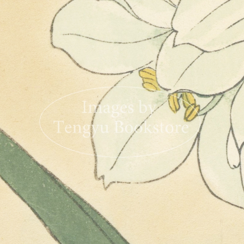 明治大正期の染色図案家 谷上広南(1879‐1928)による木版画集「西洋草花図譜」の1図。当時輸入された海外の草花をおよそ100点取り上げ、色鮮やかな木版画で描いた本作は、日本製のボタニカルアートとして人気の高い作品集です。