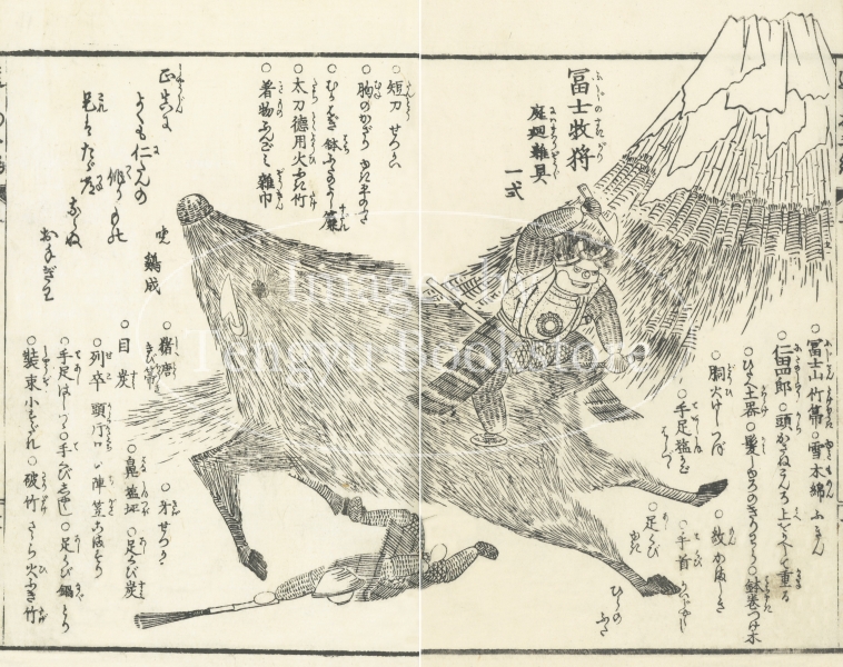 日用品を用いて縁起物や人物、動物、風景など別の形に組み立てて遊ぶ「造物」を集めた絵入本「四季造物趣向種」(しき つくりものしゅこうのたね)の1ページ。
