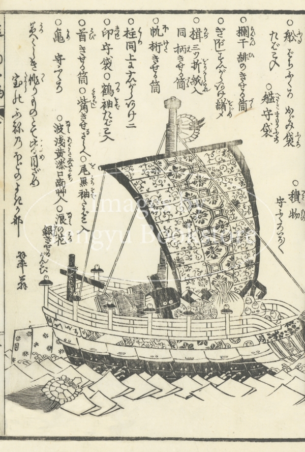 日用品を用いて縁起物や人物、動物、風景など別の形に組み立てて遊ぶ「造物」を集めた絵入本「四季造物趣向種」(しき つくりものしゅこうのたね)の1ページ。