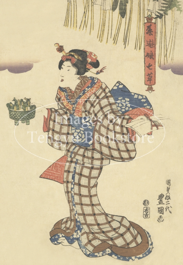 江戸時代後期を代表する浮世絵師のひとり 三代 豊国(歌川国貞:1786-1865)による連作浮世絵「春遊娘七草」の1枚。七草の寄せ植えを持った娘が描かれています。