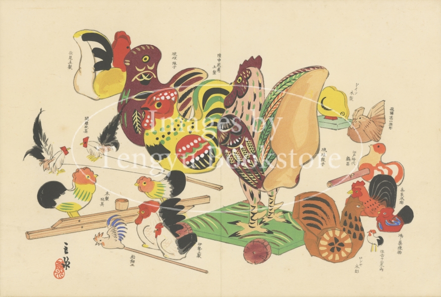 No 286 / 書名:おもちゃ十二支 / Omocha Ju-ni-shi / 作者:川崎巨泉 / Kawasaki Kyosen / 刊行国:Japan / 刊行年:1918 明治末から大正、昭和にかけて大阪で活躍した画家 川崎巨泉(1877-1942)が、日本各地の郷土玩具を収集・研究した自身のコレクションから十二支にまつわるおもちゃを選んだ木版画集の1枚。