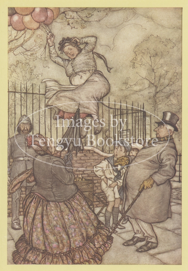 19世紀末イギリスの童話作家J.M.バリー(1860-1937)の代表作「ケンジントン公園のピーター・パン」の挿絵。イギリスを代表する挿絵画家のひとり、アーサー・ラッカム(1867-1939)がイラストをつけた本書は、広く知られているネバーランドのピーターパンの前日譚に当たる物語。ロンドンのケンジントン公園を舞台に、幼いピーターパンと妖精たちの様子が描かれています。