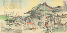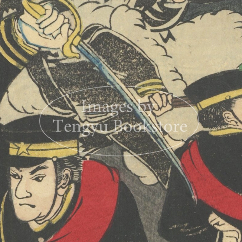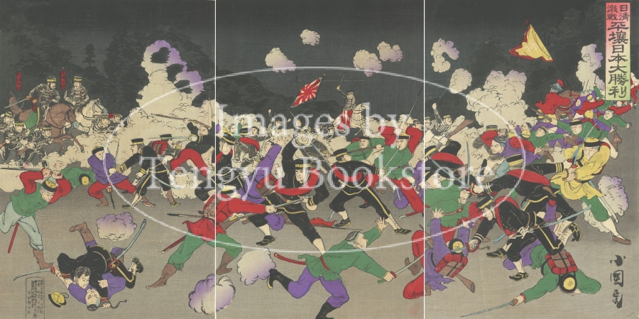 明治時代の浮世絵師 小国政による、日清戦争を題材とした三枚続の浮世絵。