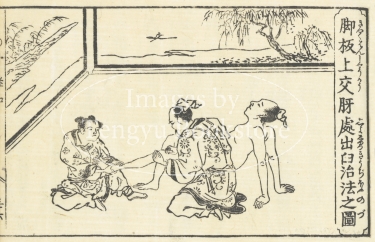 江戸時代後期に刊行された、日本で初めての整骨解説書「骨継療治重宝記」(初版:延享三年(1746) ※本図は文化7年(1810)版掲載のもの)からの一枚。