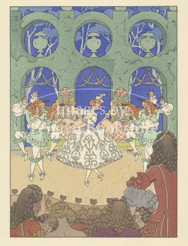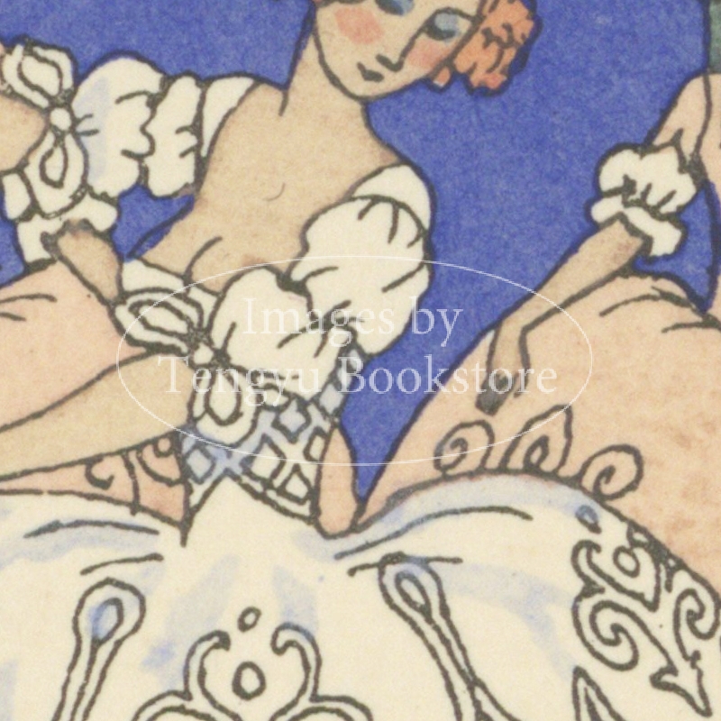 1920年代のフランスで活躍した名イラストレーター、ジョルジュ・バルビエ(1882-1932)が手がけたイラストに、ポショワール(ステンシル)彩色を施したもの。