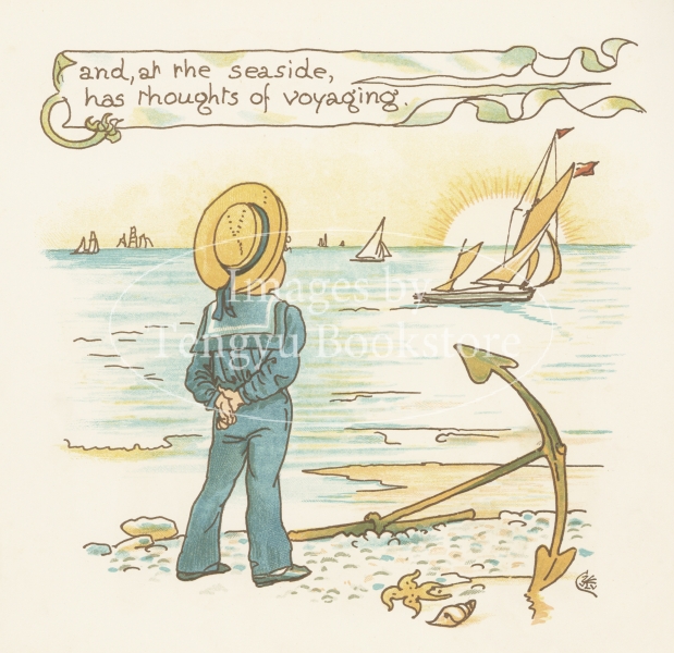ウォルター・クレインが「子供の勉強」(読み・書き・算数)をテーマに制作した3作のリトグラフ絵本「石版と石筆王国」「小さなアン女王と女王陛下の文字たち」「悪筆と辛抱あるいはABCヘビ」を1冊に合本したもの。
