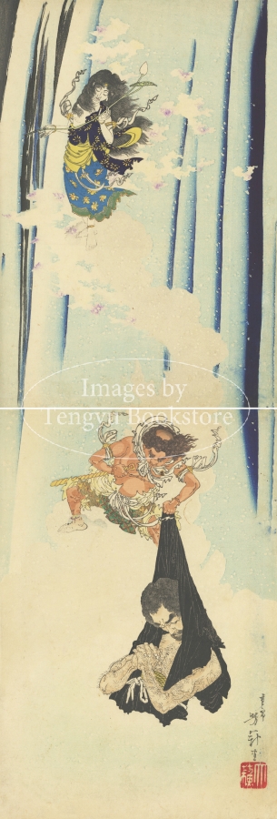平安時代の僧 文覚が、那智滝で修行をしているところへ、不動明王の眷属である矜羯羅童子と制咜迦童子が現れた場面です。