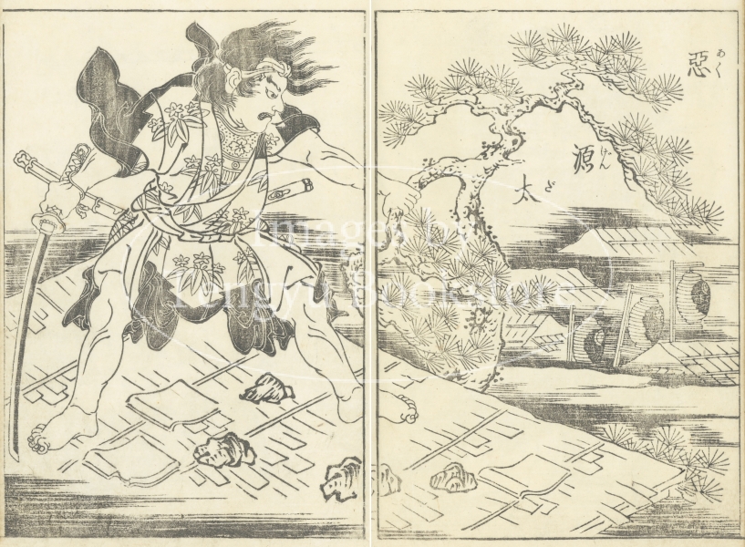 江戸中期〜後期 大阪の浮世絵師 月岡雪鼎(1726-1787)による武者絵本「絵本高名二葉草」より。日本史に名高い力持ちや武者達の武勇を紹介する一冊です。