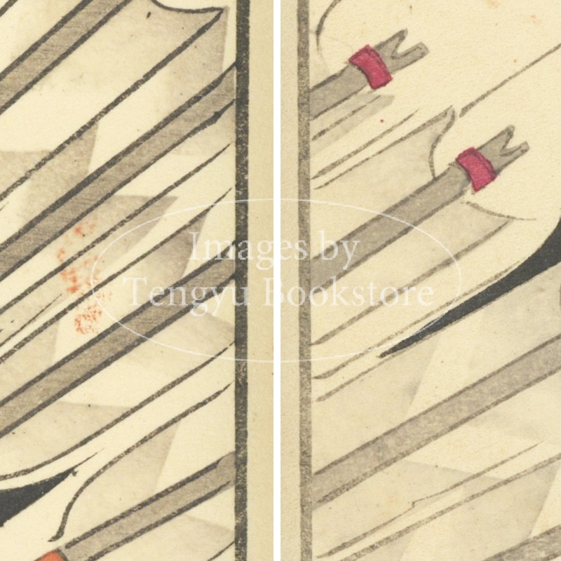 本来は2枚に分けて描かれた作品であるため、色味や図案の整合に若干の不統一があることをご了承ください。