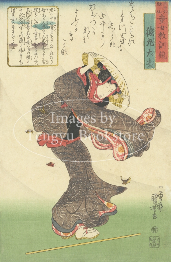 今なお人気の高い、江戸後期を代表する浮世絵師 歌川国芳(1798-1861)による連作美人画「三十六歌仙童女教訓鑑」のうちの一枚。