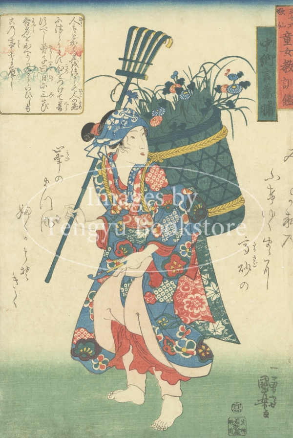 今なお人気の高い、江戸後期を代表する浮世絵師 歌川国芳(1798-1861)による連作美人画「三十六歌仙童女教訓鑑」のうちの一枚。